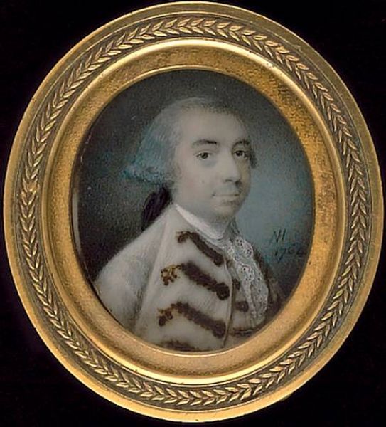 | Thomas Wright (1724-77), wearing white coat with gold frogging, matching waistcoat, white lace cravat and powdered wig worn en q | |