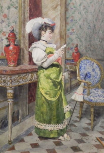 | Portrait of a lady standing full-length in a green dress reading a letter in an elegant interior | |
