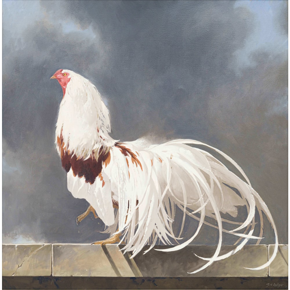 | "I once enquired whether he had ever considered poultry as a subject … True to form, he came up with something quite different: a remarkable series of canvases emerged, of single cockerels. Each grand creature strutted atop a wall, with that singular blend of brainlessness and heroic stance, the whole in a wildly decorative rendering that gives the pictures an immediate and lasting impact."Guy Graf van Moy | |