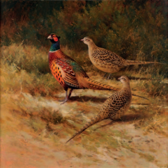 Cock and hen pheasants in a clearing