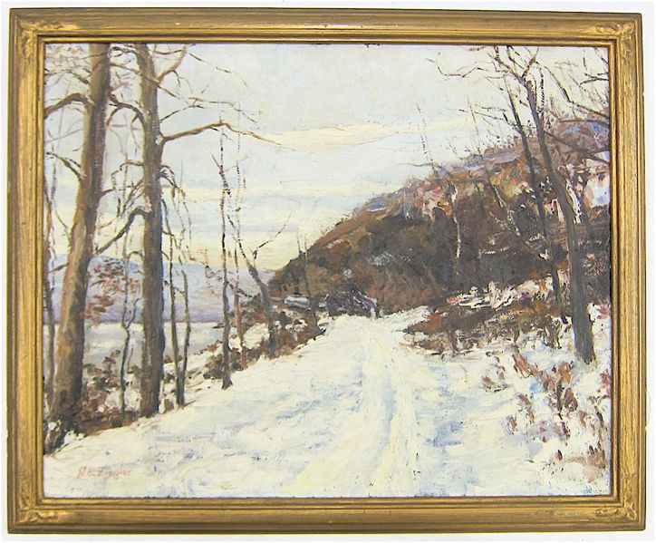 | Impressionist winter landscape with snow covered road in the foreground and mountains and river in the background | |