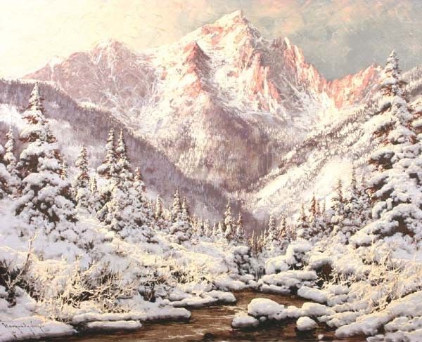 depicting a mountainous winter landscape