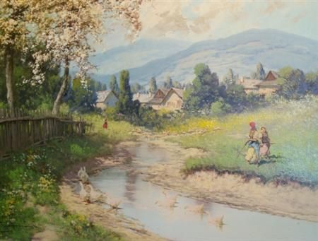 | Spring Landscape with Girls and Geese on a Riverbank | |