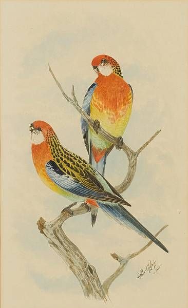 A pair of rosellas; A pair of lorikeets