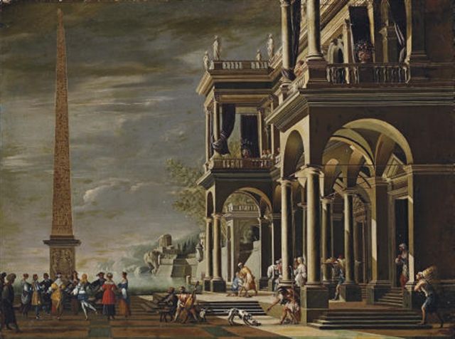 | A capriccio of a classical palazzo on a coast with elegant company dancing by an obelisk and the Return of the Prodigal Son | |