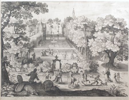 A CASTLE WITH A FORMAL GARDEN AND FIGURES AT PLAY