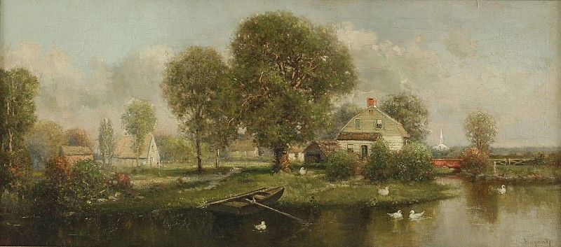 A LANDSCAPE WITH HOUSES BY A POND, POSSIBLY IN MASSACHUSETTS