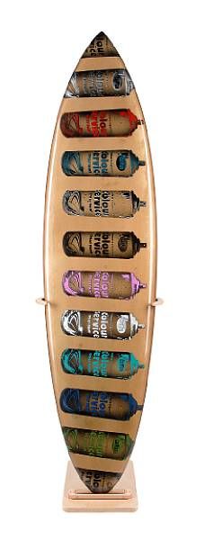 Stencil spray paint and acrylic on glassed and polished surfboard