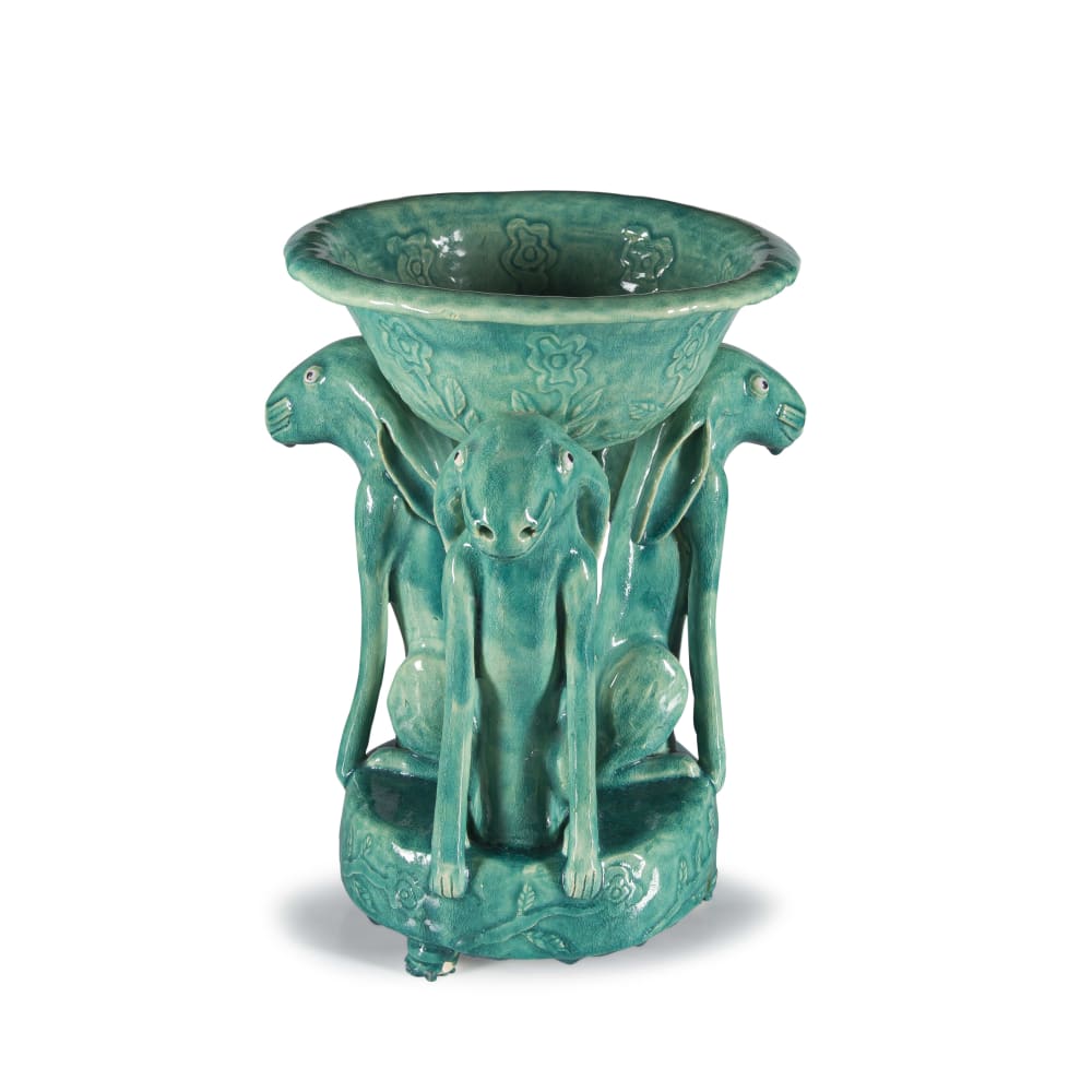 | Green-glazed Bowl with Three Seated Hares Stand | |