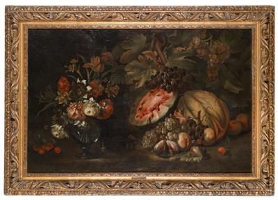 | A still life with cabbage roses, tulips, lilies and other blossoms in a glass vase placed next to water melons, figs and grapes | |