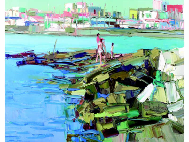 Figures on the shore, coastal city beyond