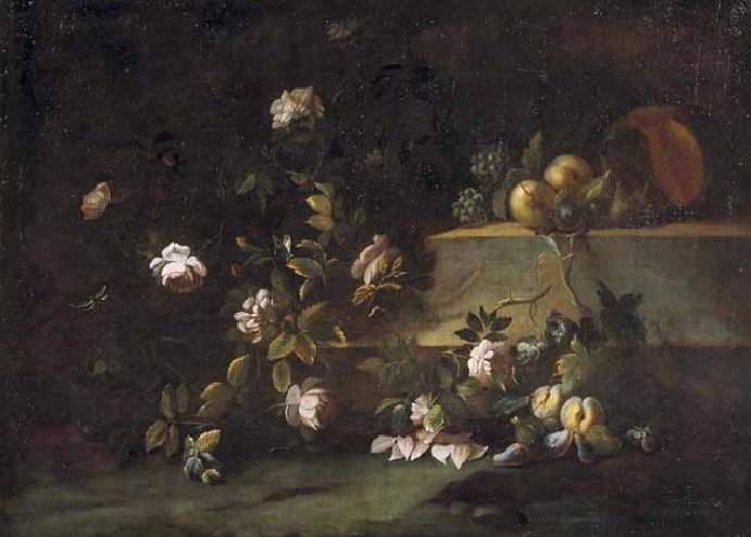 | NATURA MORTA CON FIORI, PESCHE, UVA E FICHI | |