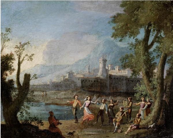 | Drovers with their flocks beside a river, a walled town in the distance; and Figures merry making on the banks of a river, a wal | |