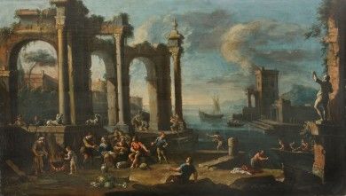 Veduta di un porto ideato con scene di genere