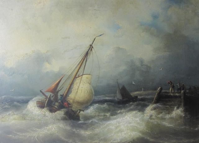 Fishing Vessels off a harbour wall in a storm, possibly at Texel