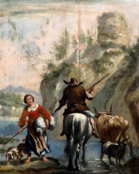 | Young maid with dog, and traveller on horseback, cattle and goat crossing a stream | |