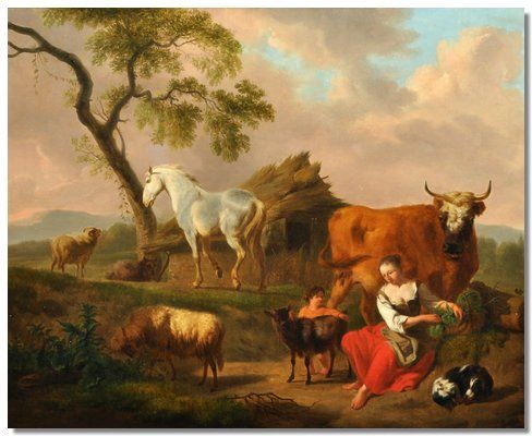 | Woman and child with a dog, cow, horse, goat and sheep, bears old label | |