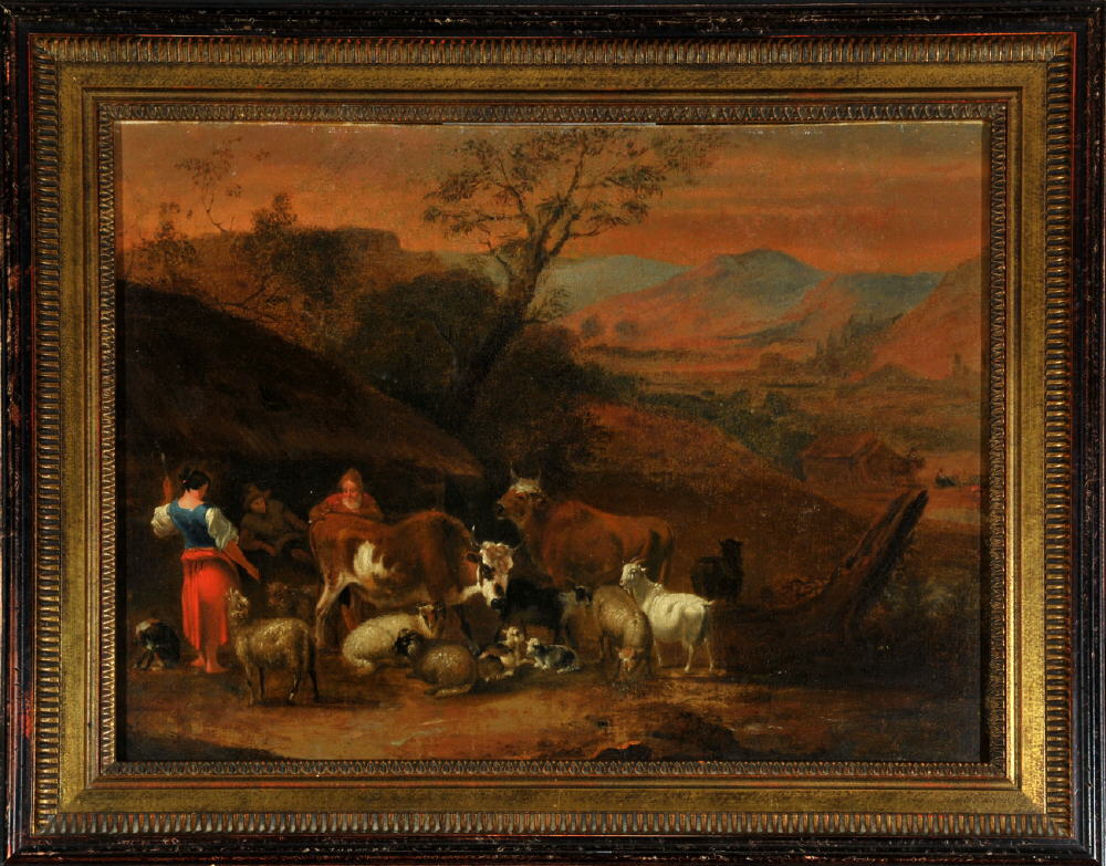 Hirtenfamilie mit Vieh vor einer Hütte in abendlicher italienischer Landschaft "