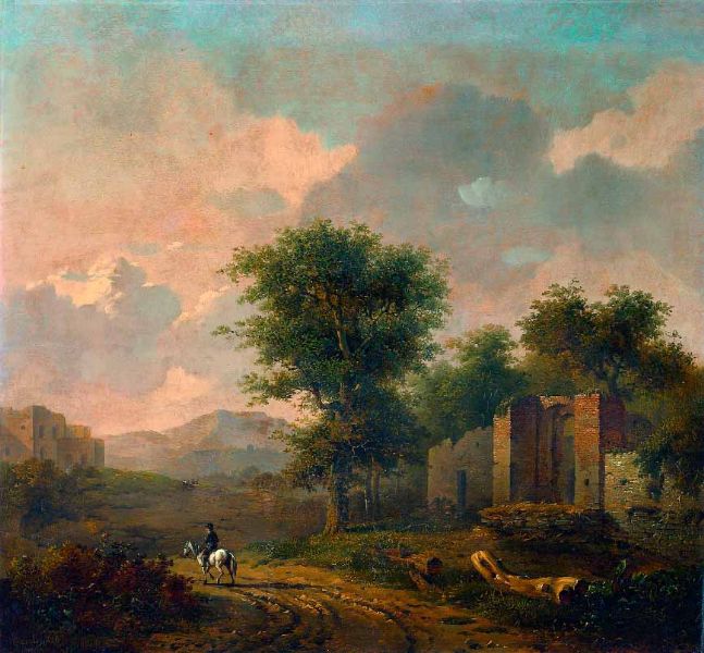 Reiter auf einem Schimmel, vor Ruinenlandschaft.