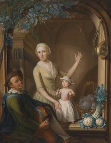 | A young woman and a child in a kitchen interior, with an organ grinder in the foreground | |