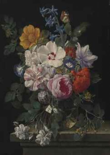 | Flowers in a glass vase with a butterfly and beetle on a stone ledge | |