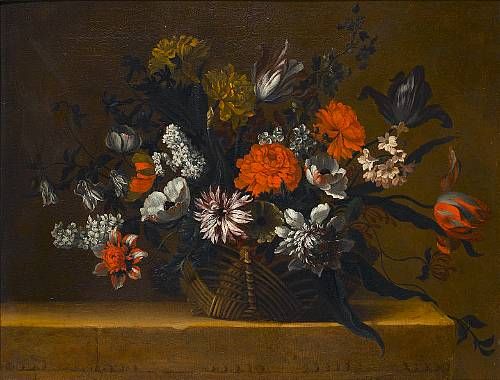 | Tulips, chrysanthemums, honeysuckle and other flowers in a basket on a stone ledge | |