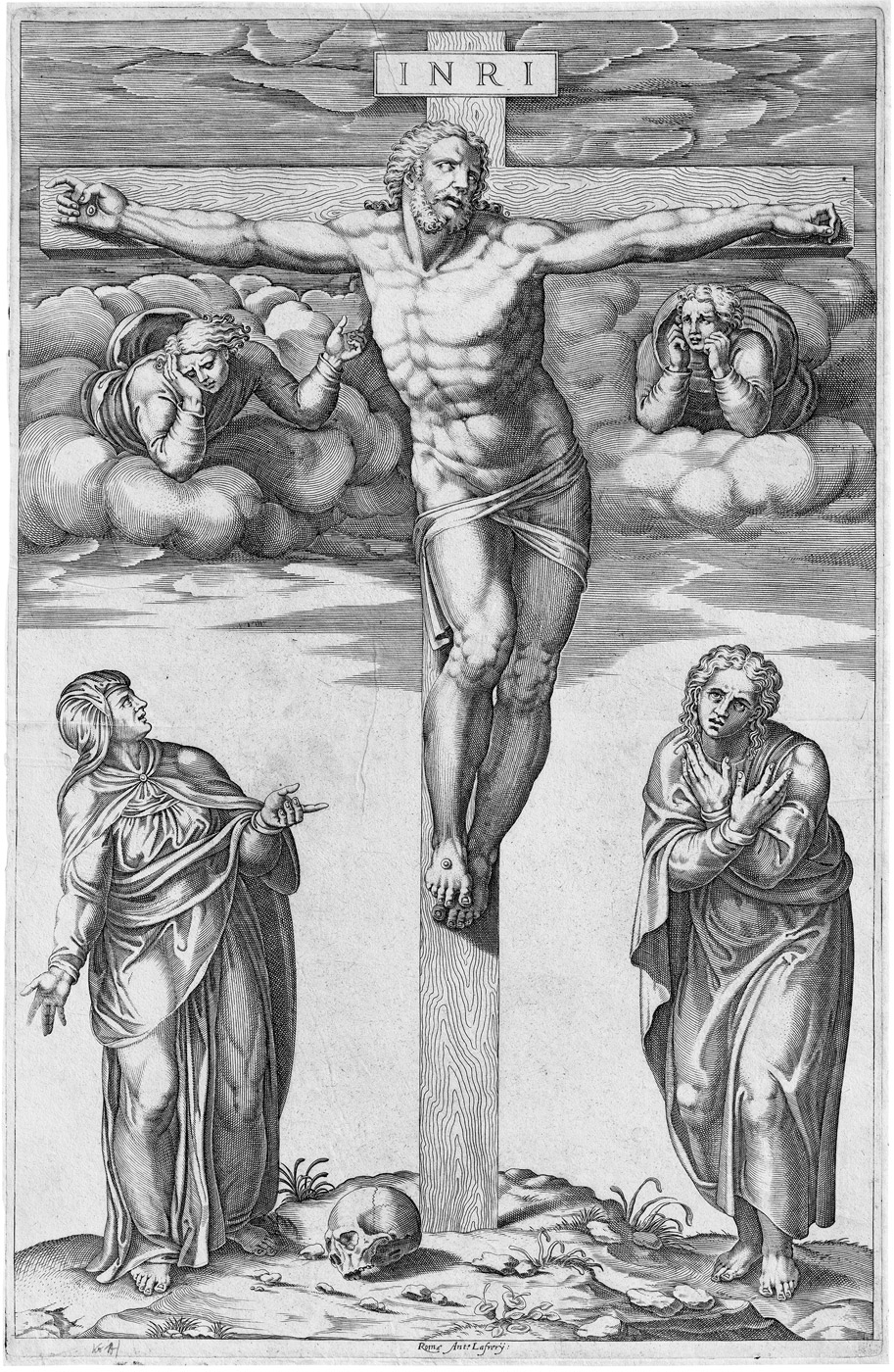 Christus am Kreuz begleitet von zwei Engeln, der hl. Jungfrau und Johannes d. Täufer