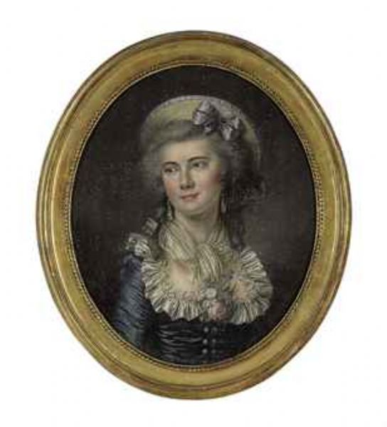 | Portrait of a lady wearing a blue dress and a hat | |
