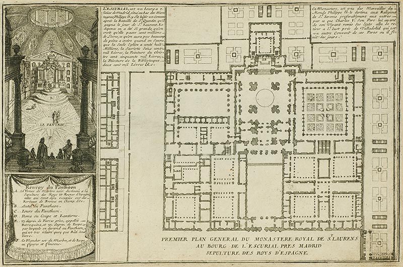 Planta del Monasterio del Escorial e interior del Panteón con una serie de cartelas explicativas