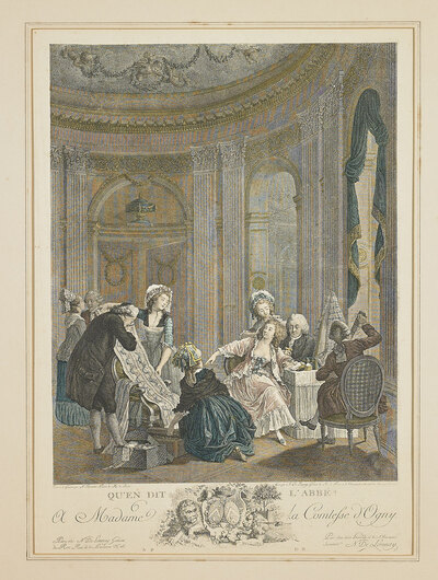 Antique hand-colored engraving by Nicolas de Launay (French, 1739-1792); titled Qu'en dit L'Abbe? A Madame la Comtesse d'Ogny; signed in plate to lower right; Provenance: Collection of Gabriella "Kay" Robertson of Loewi-Robertson Inc.; 18" x 13" (sig | |