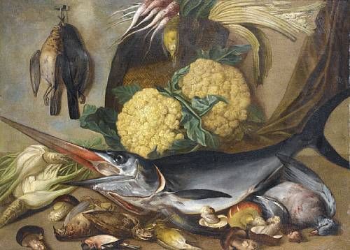 | A swordfish with dead birds and mushrooms on a table-top before a basket filled with cauliflowers and other vegetables | |