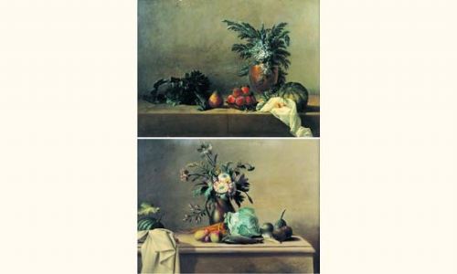 | Nature morte au vase de fleurs et légumes sur un entablement,Nature morte au vase de fleurs et fruits sur un entablement | |