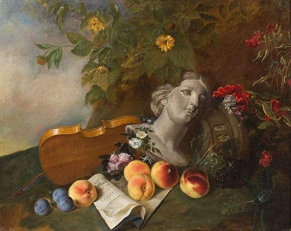| Nature morte aux pêches, raisins, prunes, violon et buste dans une végétation luxuriante. | |