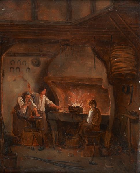 | Oficina de ferrador com forja, ferradores e ferraduras de cavalo | |