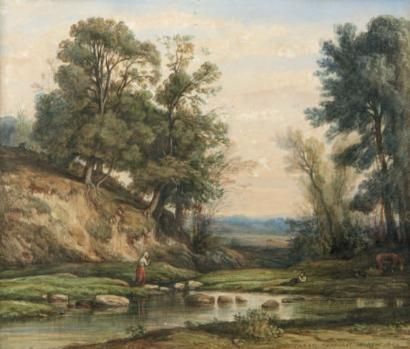 | Bergères gardant leur troupeau au bord d'une rivière dans le Limousin | |