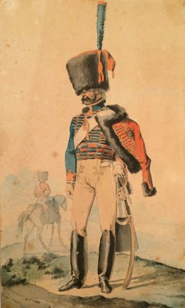 Portrait de hussard préenté en pied sur fond de paysage