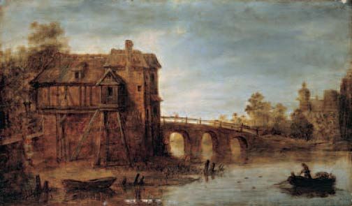 FISCHER VOR BRÜCKE UND GEBÄUDE
