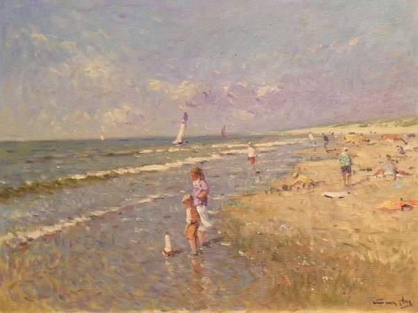BEACH SCENE, CHILDREN AT THE WATER'S EDGE
