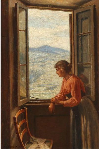 | A young woman at a window facing a mountain landscape | |