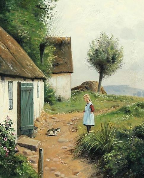 A girl and her cat in front of a thatched cottage