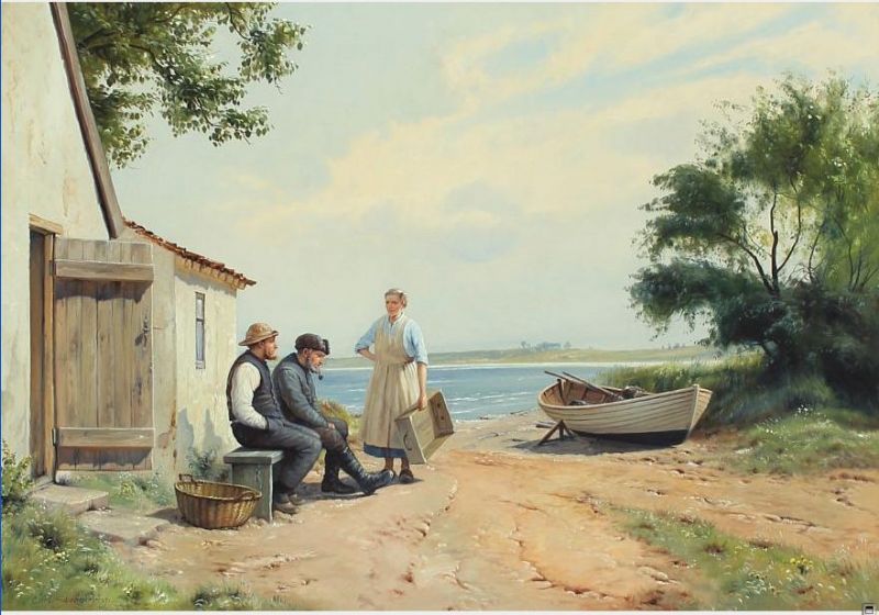 | Two fishermen sitting on a bench talking to a fisherman's wife | |