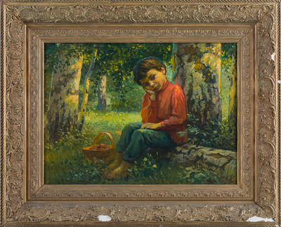 | Knabe in rotem Kittel, ermüdet vom Pilzsammeln auf Mauer sitzend | |