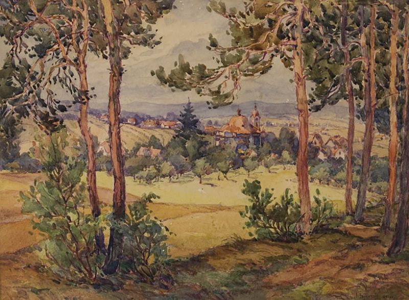 | WIEJSKI KRAJOBRAZ Z KOŚCIOŁEM I DOMAMI | |