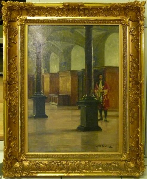 Salsinteriör med herre i barockdräkt bakom kolonn