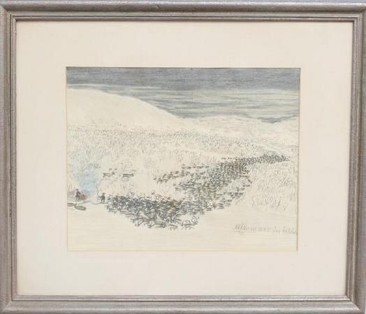 färgkrita och blyerts, renhjord och lappar i fjällandskap,