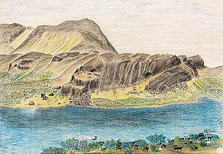 FJÄLLANDSKAP MED RENAR VID VATTEN.