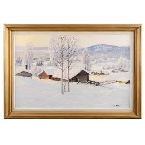 Solbelyst vinterlandskap med gårdsbyggnader. Text a tergo.
