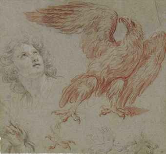 | A sheet of studies of a male head and an eagle, with subsidiary studies of eagle claws and a hand holding a brush or writing ins | |
