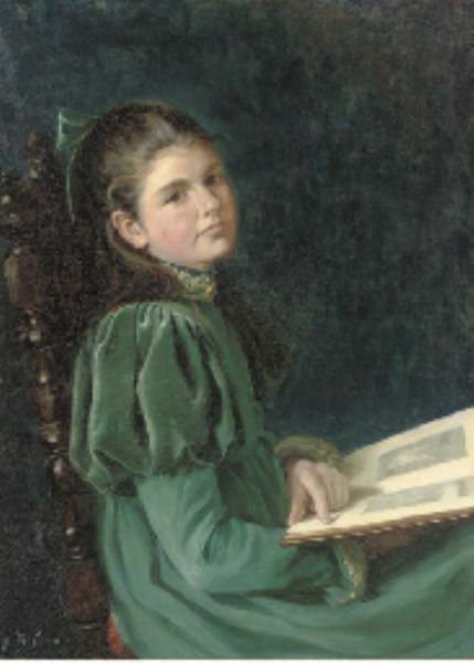 | Portrait of Ada, seated half-length, in a green dress, reading a book | |