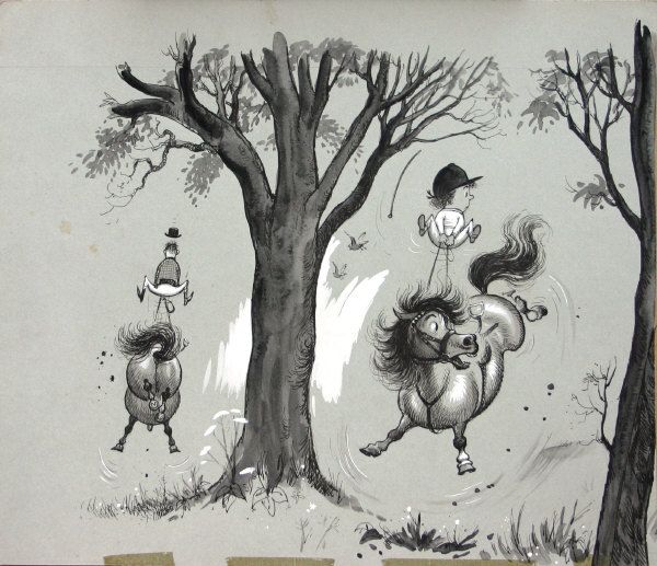 | Studies of two ponies, one from front, the other from rear, one with a child rider and one with a gentleman, both bucking and fi | |